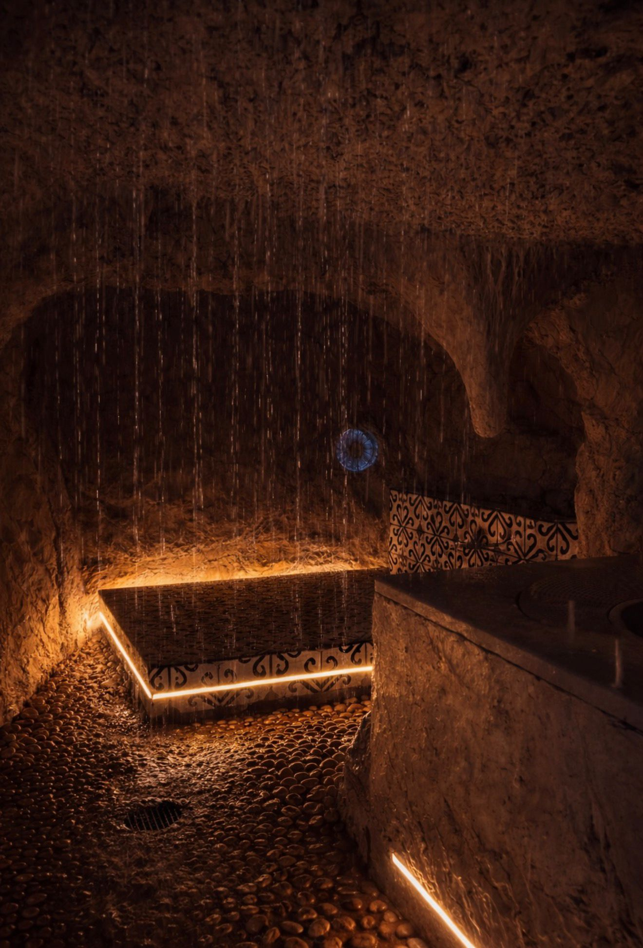 A warm stone-textured cave with gentle rainfall ambience for instant calm and nervous-system reset.
